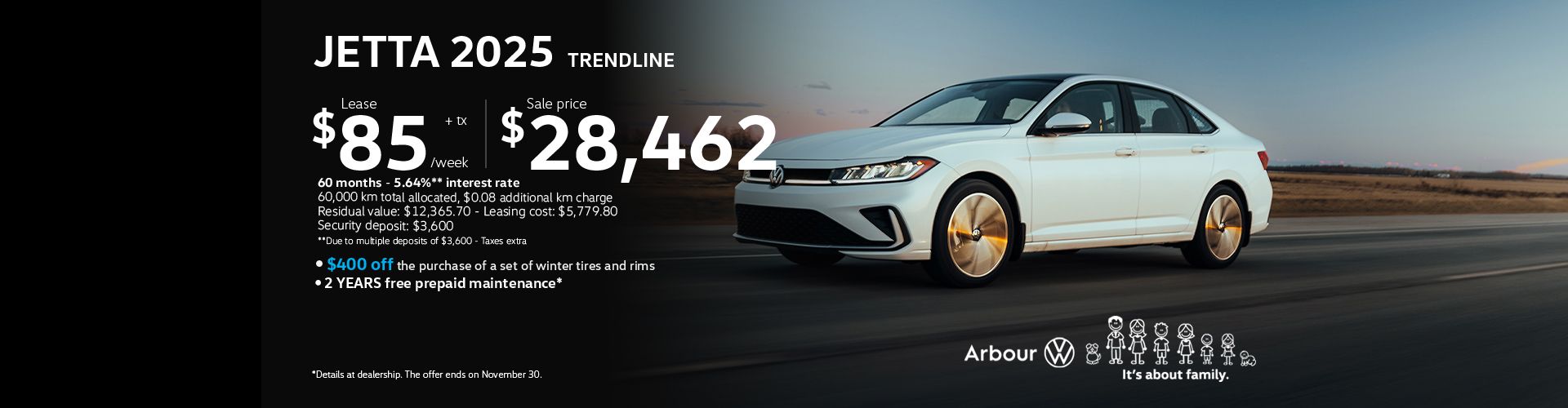 Cash purchase offer is based on the 2026 VOLKSWAGEN Jetta Trendline FWD (BU52RS ac0900560aa4) model, with 1.5L 4 cyl. engine and 8 speed Automatic transmission. Cash purchase selling price is $29,710.45 (plus taxes). Cash purchase selling price ($29,710.45) includes: Freight and PDI ($2,050.00), Admin fee ($499.00), Anti-theft (optional) ($399.95), Air conditioning excise tax ($100.00), Wheel locks (optional) ($96.00), PPSA Registration Fee (On Financing) ($48.00), Tire Duty ($22.50) including installation. Plus (GST/QST) & Licensing. Finance offer is based on the 2026 VOLKSWAGEN Jetta Trendline FWD (BU52RS ac0900560aa4) model, with 1.5L 4 cyl. engine and 8 speed Automatic transmission. Finance selling price is $29,662.45 (plus taxes). Finance payments include: Freight and PDI ($2,050.00), Admin fee ($499.00), Anti-theft (optional) ($399.95), Air conditioning excise tax ($100.00), Wheel locks (optional) ($96.00), Publication Fee ($48.00), Tire Duty ($22.50), PPSA Service Fee ($13.22) including installation. Finance offer is based on a 84 months term and 6.69% interest rate. 364 weekly payments of $102.29 ($117.61 taxes included) with $0.00 cash down and $0.00 net trade in. Cash down payments are due upon vehicle delivery. Trade-in tax credits require proof of ownership. Finance total obligation is $42,810.04 (taxes included). Finance total cost of credit is $8,644.42. Annual Percentage Rate (APR) is 6.7%. Limited time purchase financing offer on approved credit. Some customers will not qualify. Rates and requirements may vary depending on credit worthiness. Payments and conditions may vary for a commercial use. All applicable taxes are calculated on the total amount prior to deduction of the down payment. Lease offer is based on the 2026 VOLKSWAGEN Jetta Trendline FWD (BU52RS ac0900560aa4) model, with 1.5L 4 cyl. engine and 8 speed Automatic transmission. Lease selling price is $29,662.45 (plus taxes). Lease payments include: Freight and PDI ($2,050.00), Admin fee ($499.00), Anti-theft (optional) ($399.95), Air conditioning excise tax ($100.00), Wheel locks (optional) ($96.00), Tire Duty ($22.50) including installation. Lease payments exclude: Publication Fee ($48.00), PPSA Service Fee ($11.50). Lease offer is based on a 60 months term and 6.99% interest rate. 260 weekly payments of $96.79 ($111.28 taxes included) with $0.00 cash down and $0.00 net trade in. $0.00 down payment and tax on down payment, $0.00 net trade-in and $111.28 first payment are due at lease inception. Total amount due at lease inception is $622.51 ($0.00 down payment, Security deposit ($450.00), First payment ($111.28), Publication Fee ($48.00), PPSA Service Fee ($11.50) and (GST/QST) $1.73). Trade-in tax credits require proof of ownership. Lease offer is based on a 16000 kilometer allowance per year. $0.15 fee per excess kilometer will apply. Estimated vehicle residual value is $11,922.75. An option to purchase at lease end (Buy Back Value) of $12,422.75 may be available. A security deposit might be required. Limited time leasing offer on approved credit. Some customers will not qualify. Rates and requirements may vary depending on credit worthiness. Payments and conditions may vary for a commercial use. Taxes on initial cash down and after tax rebates (including government rebate) are excluded and must be paid upon delivery. Lease total obligation is $29,444.03 (taxes included). Lease total cost of credit is $7,925.70. Annual Percentage Rate (APR) is 7.54%. The illustrated vehicle is based on the 2026 VOLKSWAGEN Jetta Highline FWD (BU54RS bf3351c8f450) model, with 1.5L 4 cyl. engine and 8 speed Automatic transmission. The illustrated vehicle's cash purchase selling price is $35,810.45. Levy and other environmental or related levies, other taxes (including, where applicable, GST and PST or HST), additional options, license, insurance and registration are extra. While every reasonable effort is made to ensure the accuracy of this information, we are not responsible for any errors or omissions contained on these pages. Please verify all information and pricing with a sales representative or ask online. The dealership reserves the right to make changes at any time, without notice, to the prices, rates, models, materials, equipment, specifications, and availability, or to discontinue models or equipment. Vehicle trade-ins are subject to dealer's approval. Trade-in tax credits require proof of ownership.