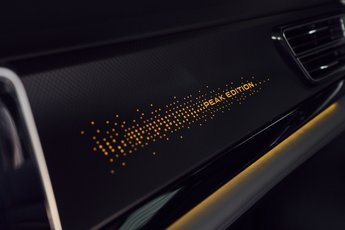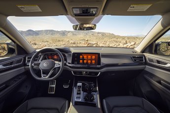 The face of Peak Edition models immediately stands out from other Atlas trims with a rugged front fascia and underbody cladding in silver. The lower fascia features a gloss-black "X" design element that was borrowed from the Atlas Cross Sport. The blacked-out grille has two chrome strips that run on each side of the illuminated logo. The unique touches continue on the interior, which features a Titan Black leatherette, light grey accents and orange contrast stitching, and a black metallic check pattern on the dashboard and door inserts. Furthermore, the steering wheel clip bears the same logo as the exterior badging and ambient lighting with 30 colour choices is included.