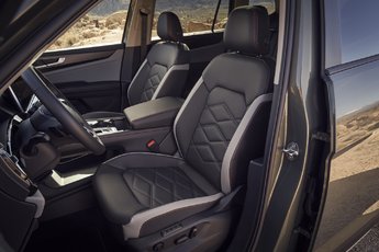 Additionally, the 2024 Volkswagen Atlas Peak Edition features a large gloss-black badge on the front quarter panel with the Peak Edition logo in orange and chrome. Eighteen-inch black alloy wheels with 255/60 all-terrain tires are included for added versatility, along with rugged side sills in black and silver and black mirror caps, window surround, wheel arches, and roof rails. At the rear of the vehicle, a black tailgate strip meets up with a rugged black and silver diffuser with chrome exhaust bezels. Additionally, two new exterior colours - Avocado Green and Pure Grey - are exclusive to this trimline.