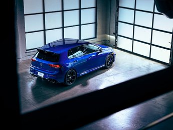 Dans l'habitacle, l'héritage de la haute performance est repris. Des inserts décoratifs en fibre de carbone véritable ornent le tableau de bord et les garnitures des portes avant, une première pour un véhicule de série Volkswagen. Cette ambiance de haute performance est subtilement rappelée par le porte-clés, qui arbore un logo "R" à la finition bleue, spécifique à l'édition 20e anniversaire.